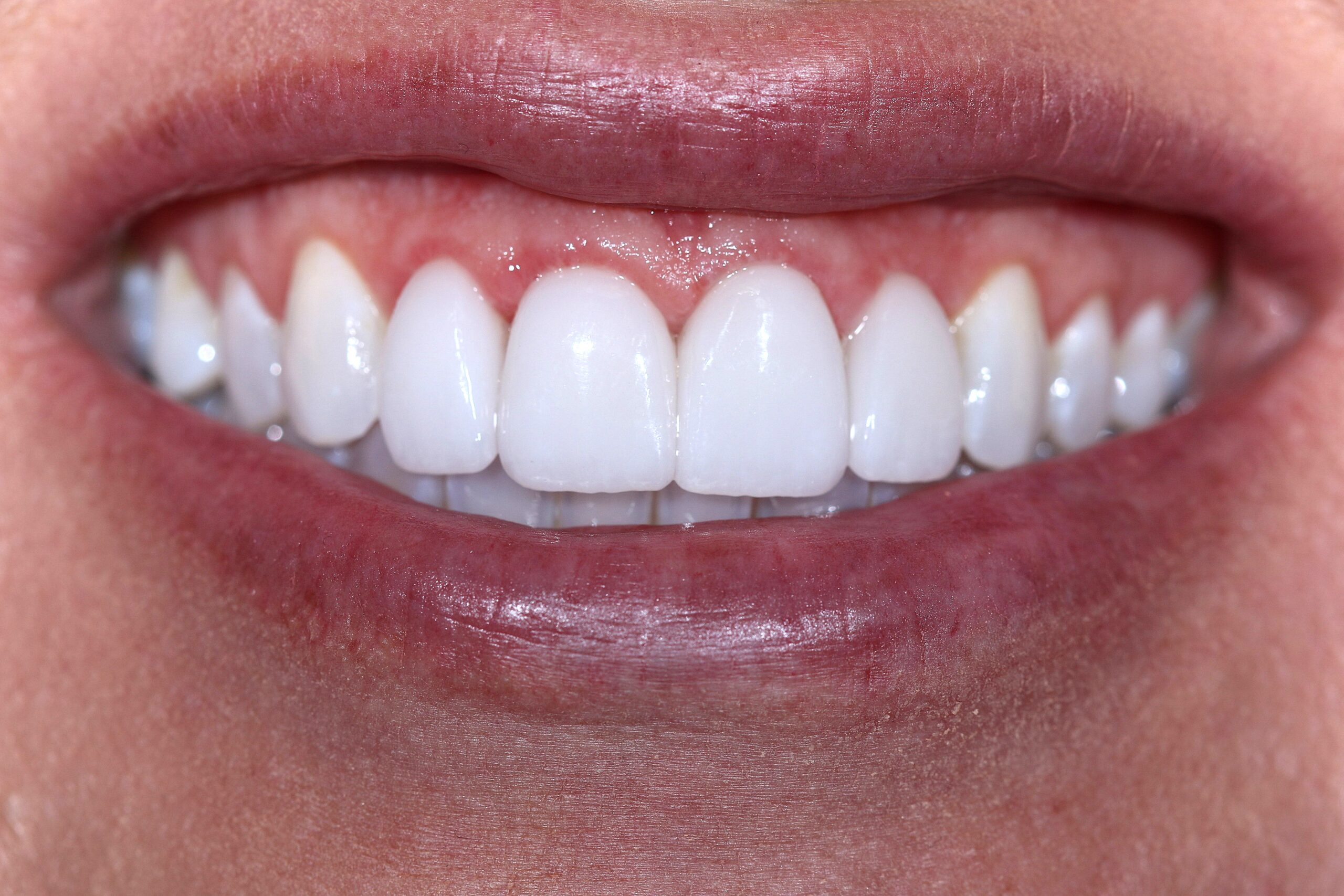A young patient sought cosmetic improvements for discolored front teeth and opted for conservative porcelain veneers after discussing options. A clinical crown lengthening procedure revealed more teeth than expected, allowing for veneering only two teeth instead of four, resulting in a stunning and cost-effective outcome. Photographic documentation guided the creation of beautiful porcelain restorations, and the patient now receives compliments on her natural-looking smile, with many surprised that they are veneers.